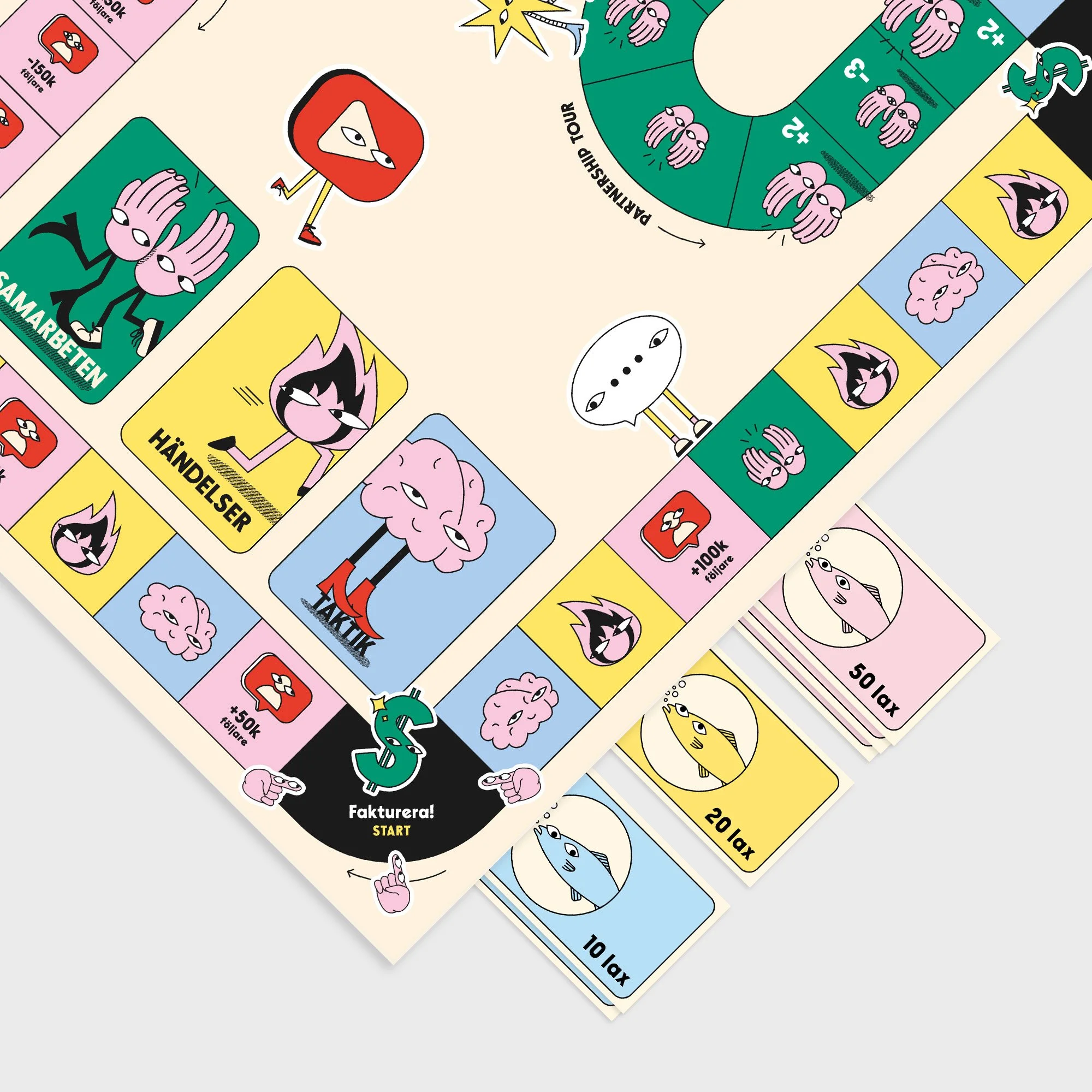 "Får man chansen att formge Influencerspelet från Ninja Print så tar man den! Att få maxa med färg, form och illustration var otroligt roligt och givande. Det var en utmaning att leka med influencervärlden och göra satir utan att vara för elak. Nu blev det några sorts ängsliga prylar på ben som springer runt utan mål och riktning. Ganska kul ändå. En karamell!"